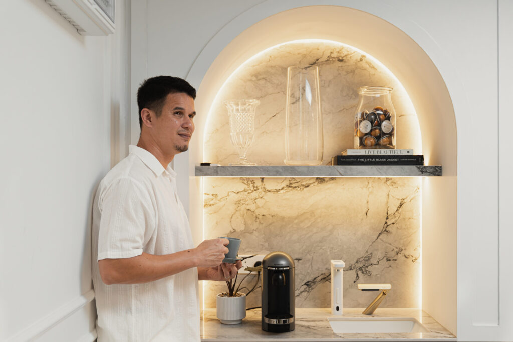 Bathed in natural light, this corner combines crisp white cabinetry with brushed gold fixtures for a touch of timeless refinement. The backsplash and countertop, clad in Mysa Metamorfico, bring depth and movement with their veined elegance, softening the clean geometry of the space. Thoughtful layering of textures — from the matte cabinetry to the luminous stone — creates a balance of sophistication and warmth.